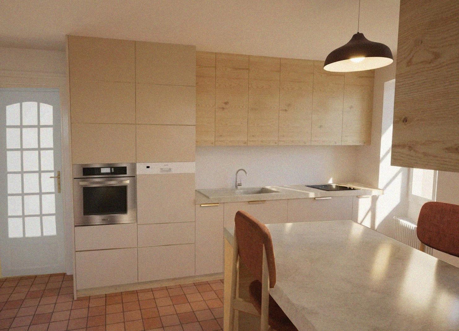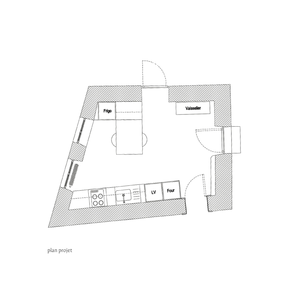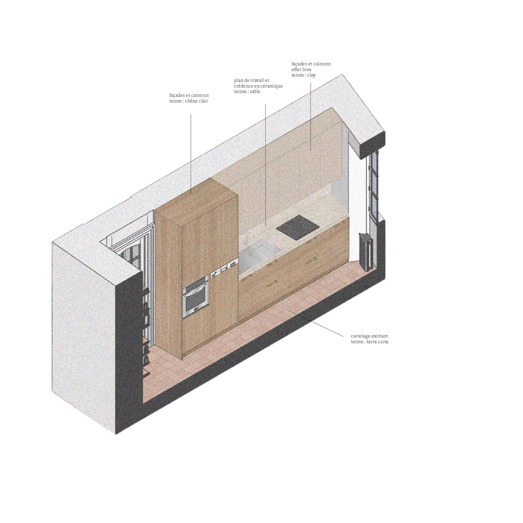 Spatialement, la nouvelle cuisine est constituée d’un bloc linéaire de toute hauteur possédant la grande partie des éléments d’une cuisine équipée (four, micro-onde, lave-vaisselle, évier, plaques de cuisson ainsi que de nombreux rangements) permettant aussi d’avoir le four et le lave-vaisselle surélevés. En face, se trouvent le frigo ainsi que la cafetière et des rangements fermés pour du petits électro-ménager (grille pain, bouilloire).