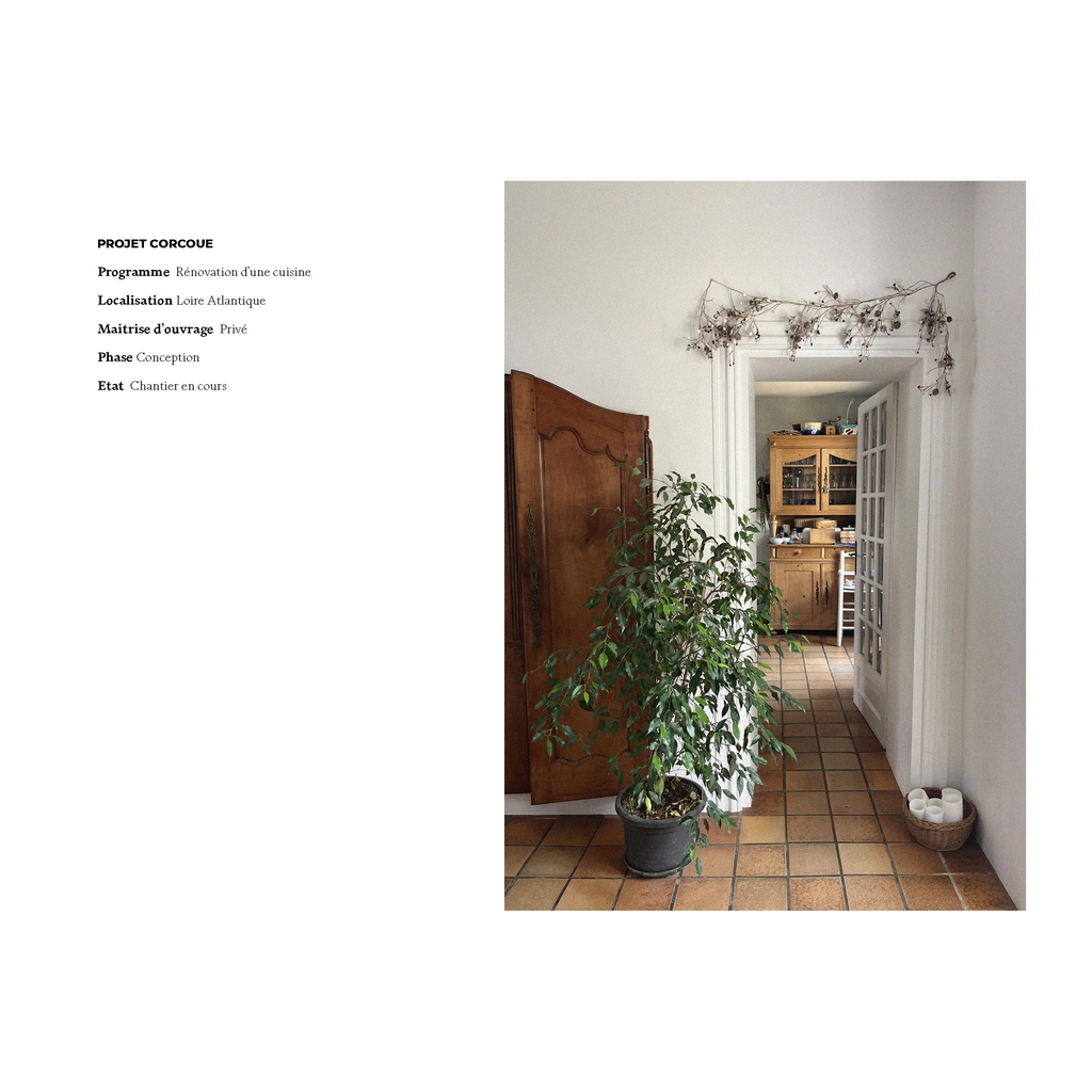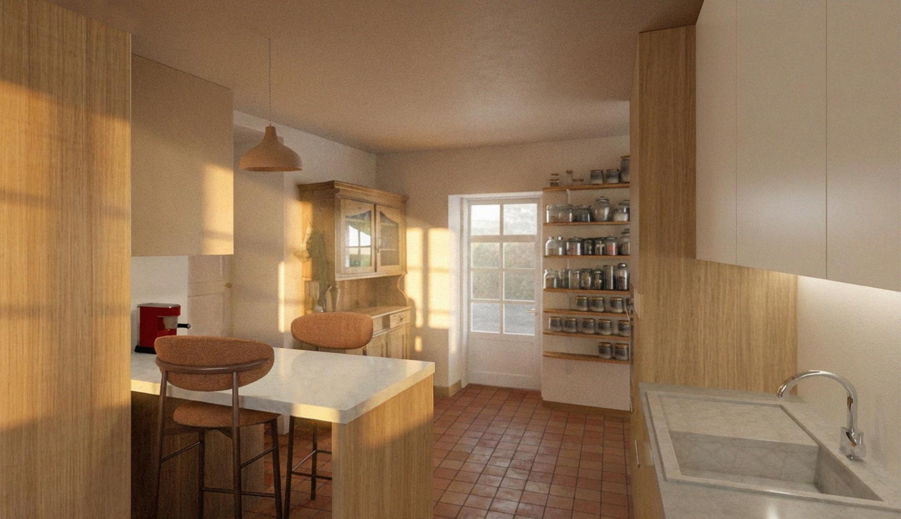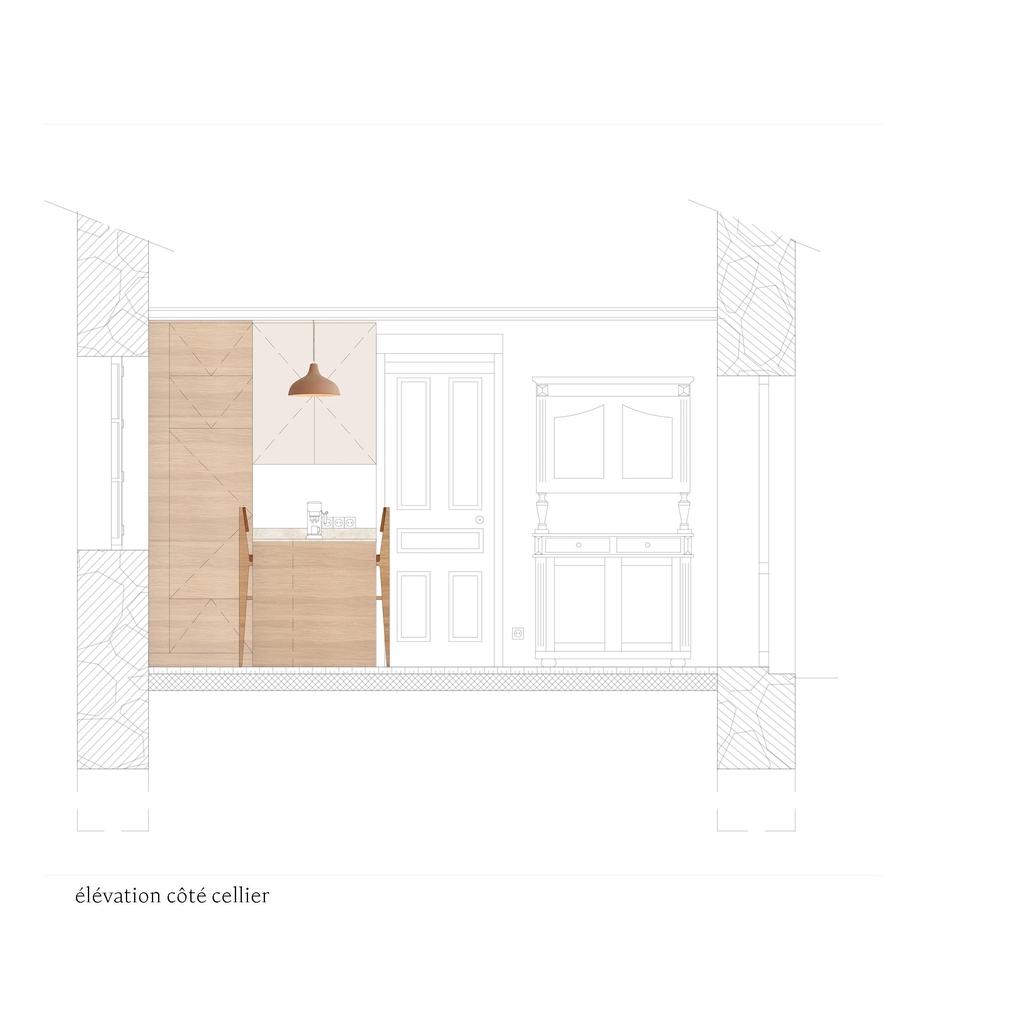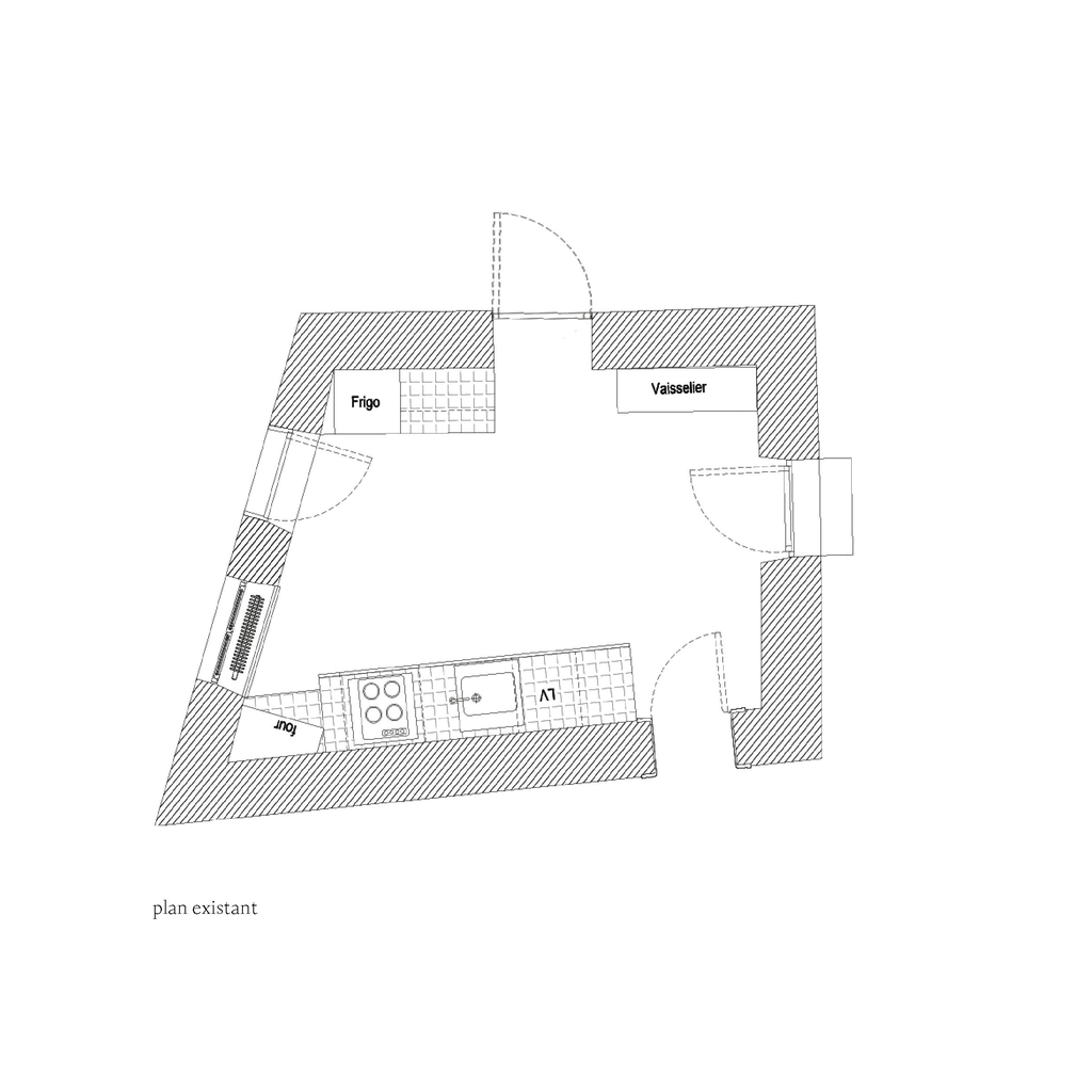 Spatialement, la nouvelle cuisine est constituée d’un bloc linéaire de toute hauteur possédant la grande partie des éléments d’une cuisine équipée (four, micro-onde, lave-vaisselle, évier, plaques de cuisson ainsi que de nombreux rangements) permettant aussi d’avoir le four et le lave-vaisselle surélevés. En face, se trouvent le frigo ainsi que la cafetière et des rangements fermés pour du petits électro-ménager (grille pain, bouilloire).